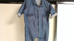 薄手のデニム生地でロンパースを作りました。制作時間:2日材料:薄手デニム生地110cm幅1.2m、プラスナップ(メタル9組、青2組)、バネホック1組、18mm幅綾テープ70cm、カシメ2組作り方①型紙を作り布を裁断する上半身は90サイズのシ...