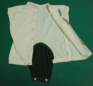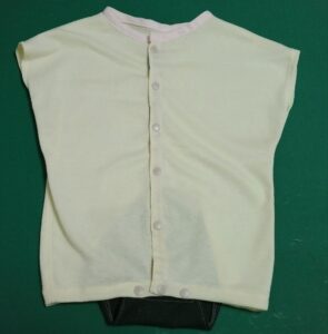 材料:ニット110cm幅で60cm程度、襟ぐり用バイアステープ、スナップ補強用の綾テープ