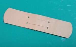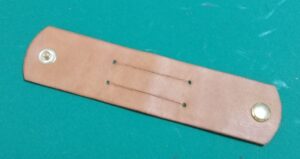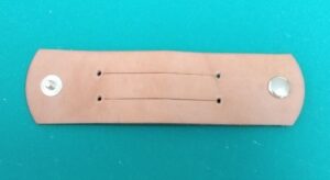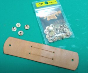 材料:革の端切れ(今回は牛ヌメ革・タン色1.2mm厚を使いました)、10mmバネホック1セット(クラフト社・1041-02)