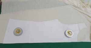 2枚合わせて端にジグザグミシンをかけたら後ろ見頃側に倒して、肩山線から5mm程度のところを縫って固定します。