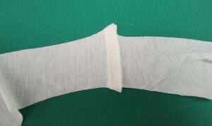 ニットは縦方向があまり伸びないので45度の斜めではなく縦で切っています。