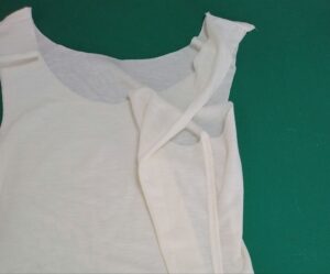 肩山同様に2枚合わせて端にジグザグミシンをかけたら後ろ見頃側に倒して、肩山線から5mm程度のところを縫って固定します。