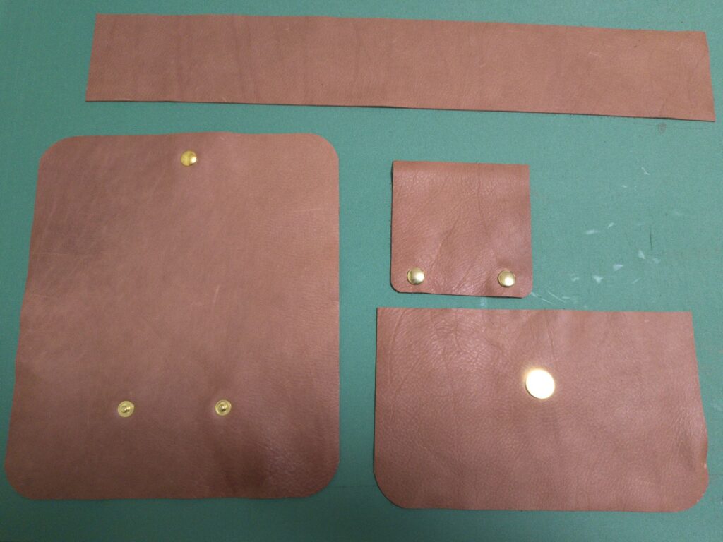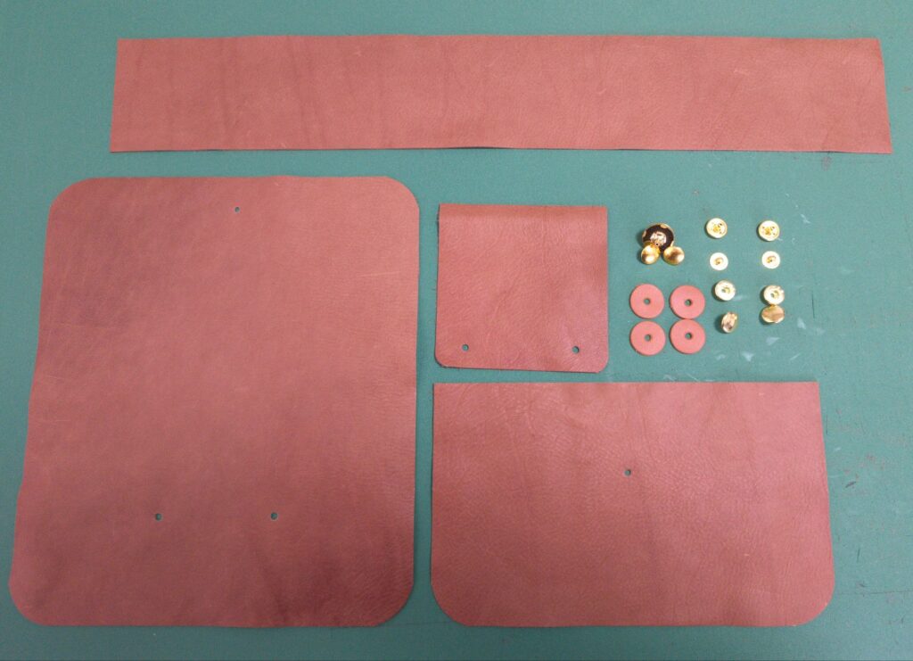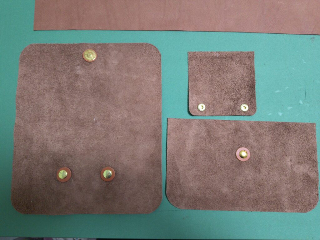 材料:牛革(カーフ・クロム鞣し・厚み1.2mm←もっと硬めのがあったらそっちの方がおすすめ)、両面マグネットホック(Φ18mm)1セット、両面バネホック(Φ13mm、足長6mm)2セット