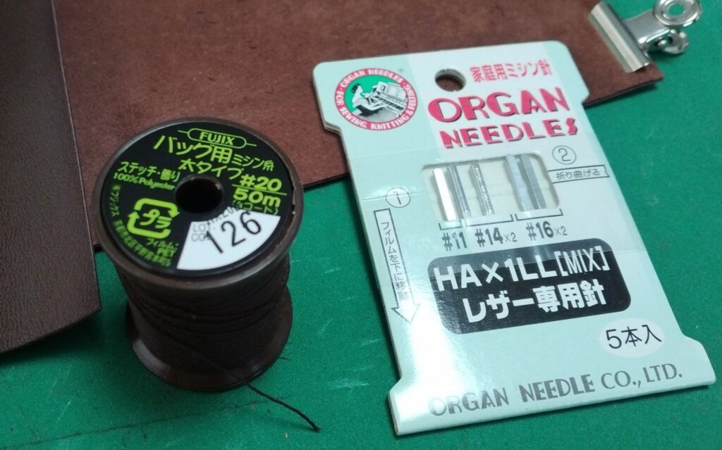 使用したのはORGANのレザー専用針16号。糸はFUJIXバッグ用ミシン糸の太タイプ20号。