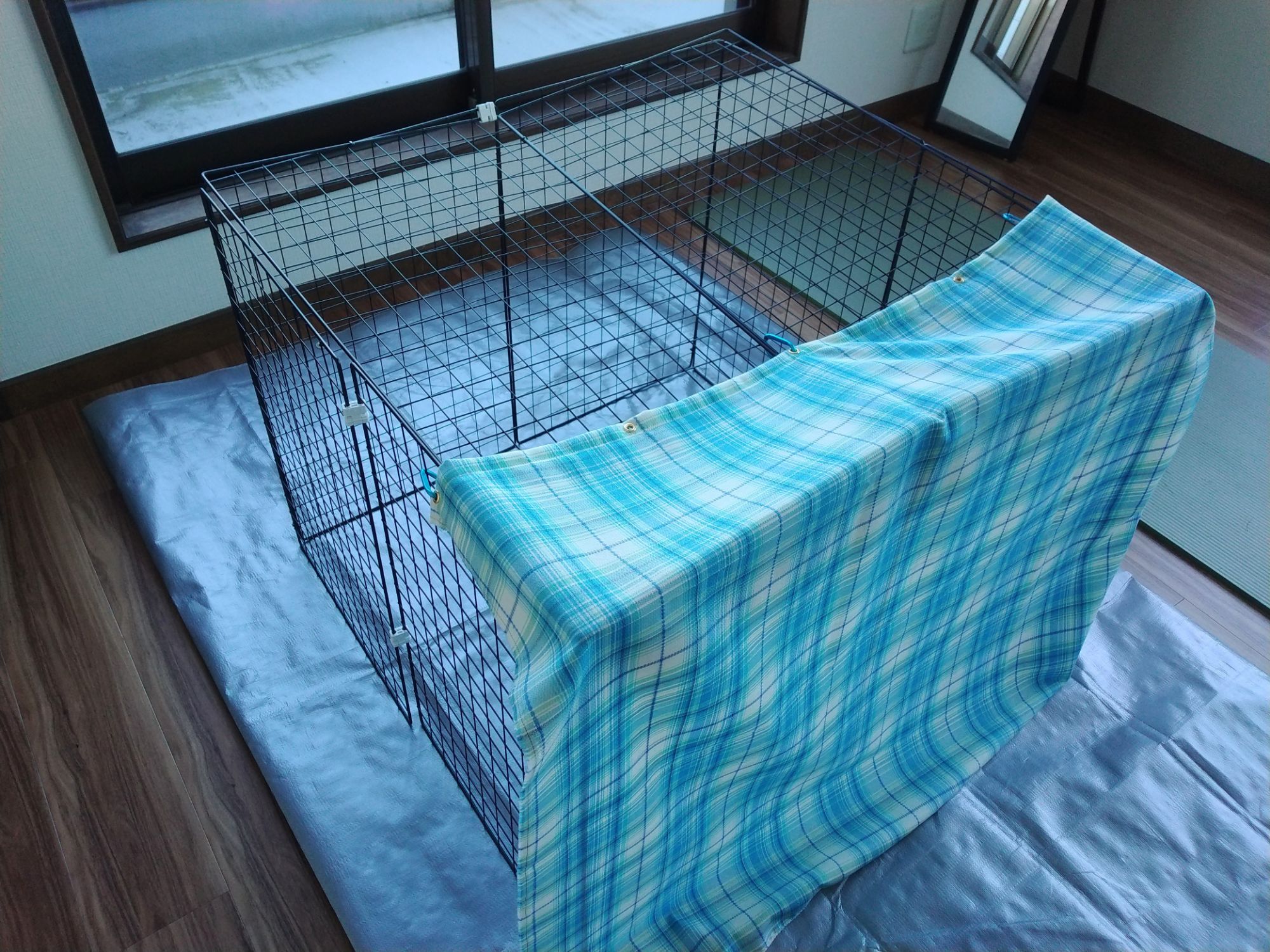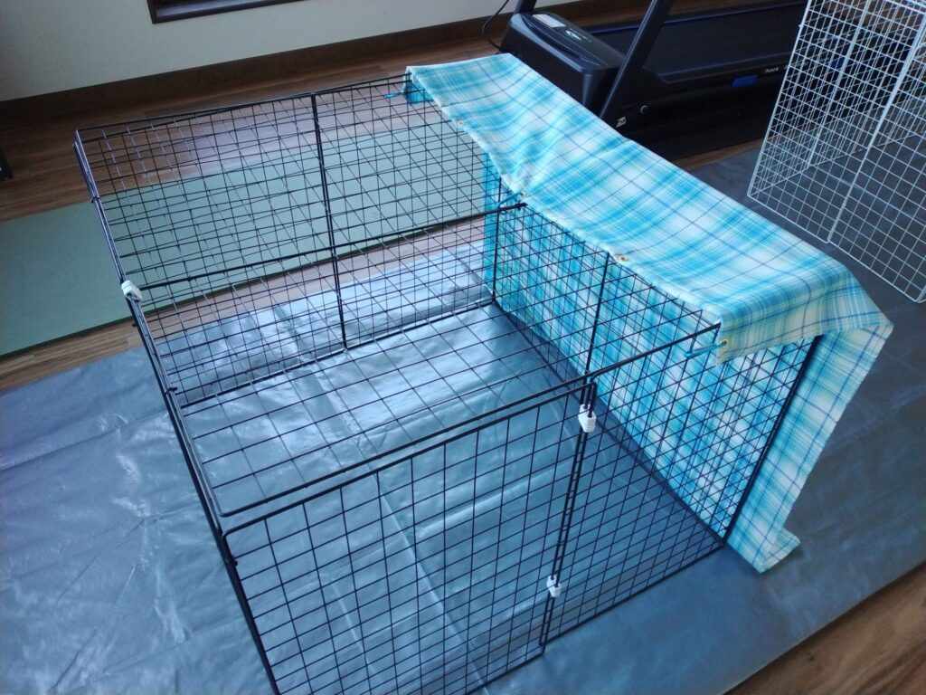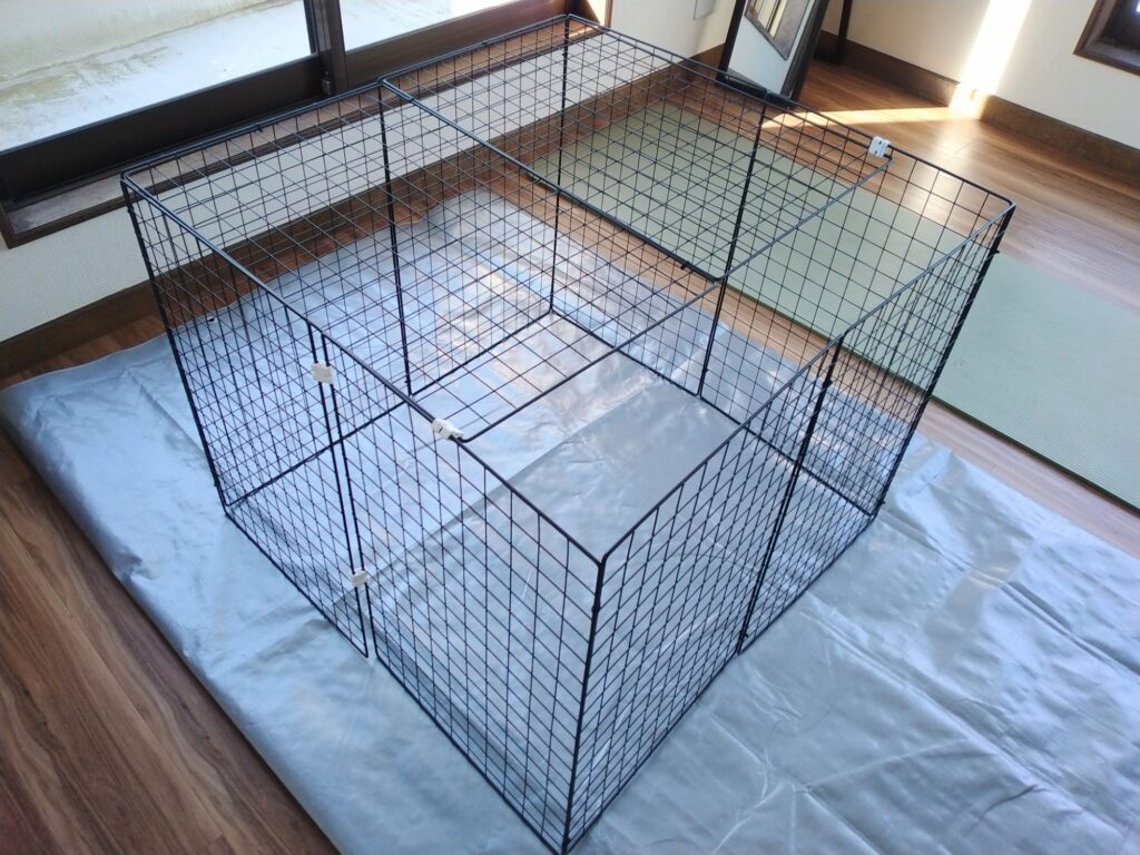 ケージはダイソーの62cm×40cm(200円)のもの10枚を結束バンドとジョイントで繋げたもの。