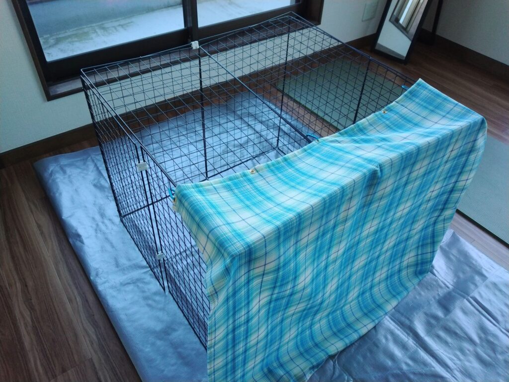 我が家の2匹のうさぎはほぼ放し飼いなのですが、大掃除や帰省などで一時的に使うケージに垂れ幕をつけました。