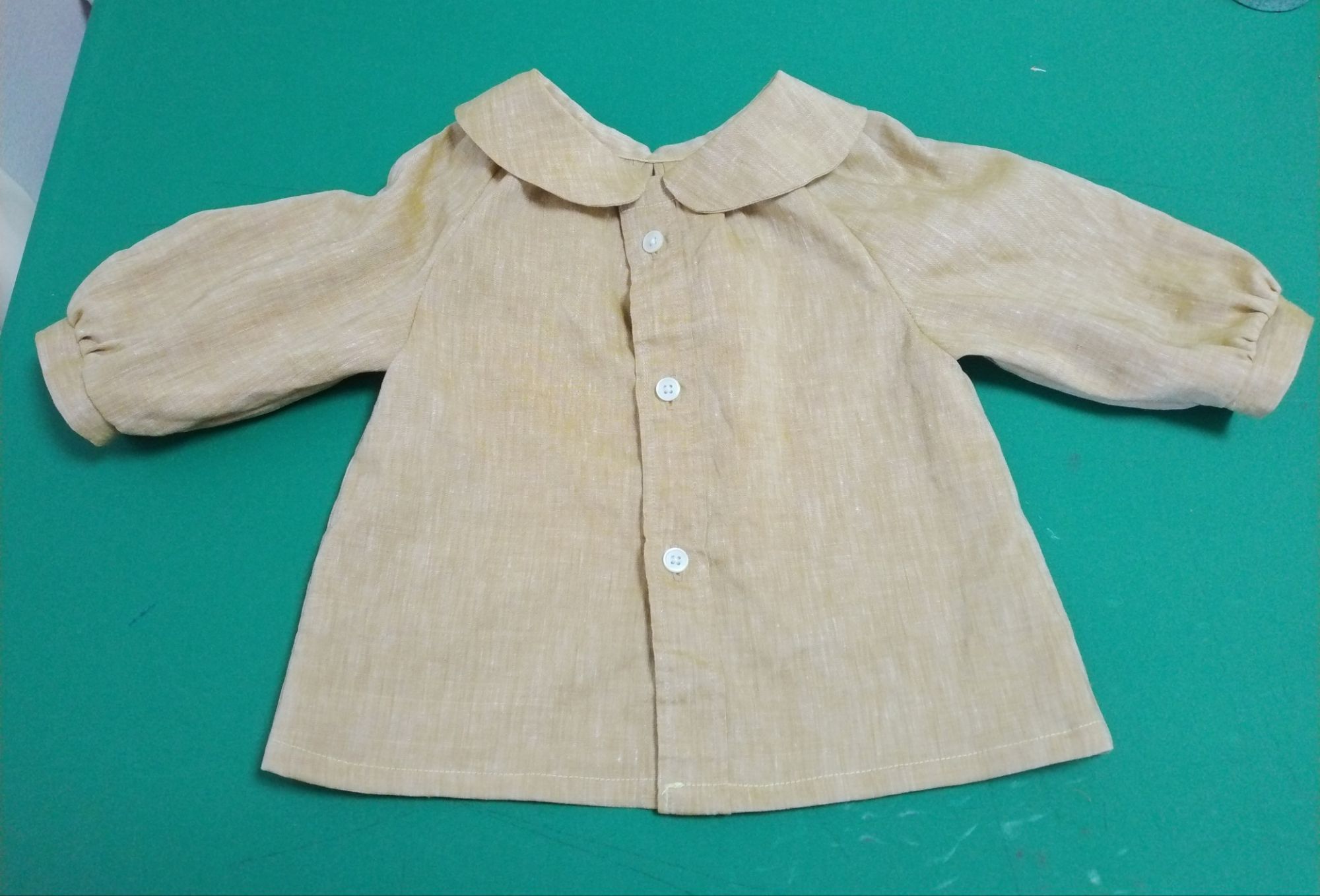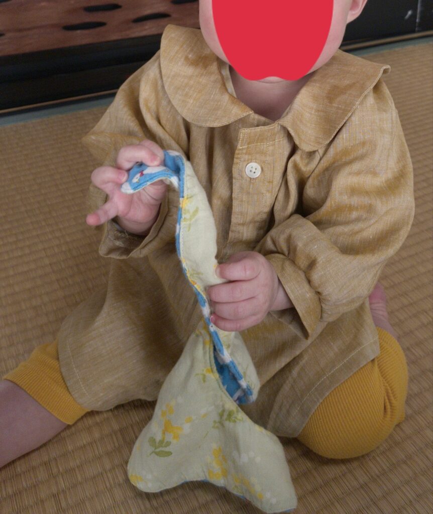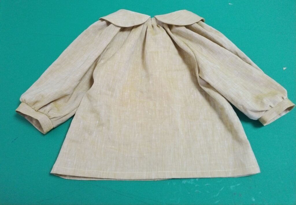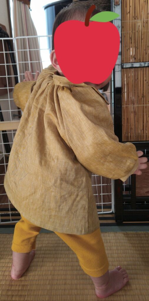 こんなかんじ。まだ1歳ですが幼稚園スモックみたいでかわいい。ただ、元のシャツがリネンのやつだったので、毎回アイロンかけないとしわっしわになるのが欠点です。子供服ってバンバン洗うからできるだけアイロン避けたいですよね。