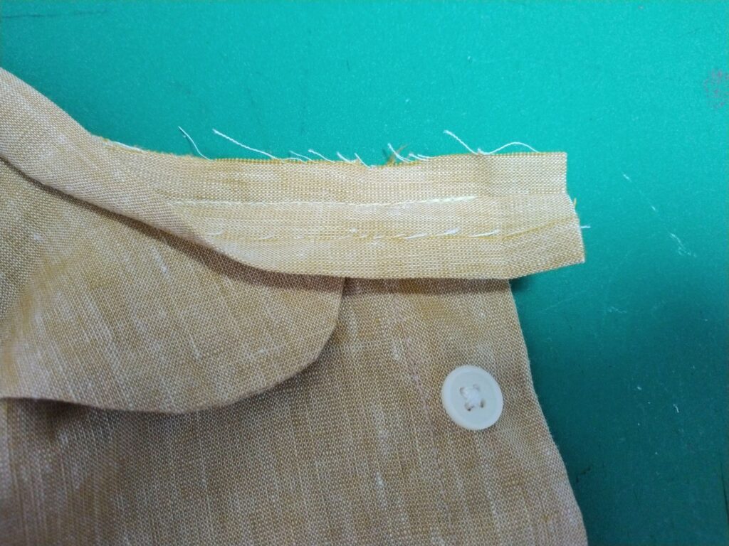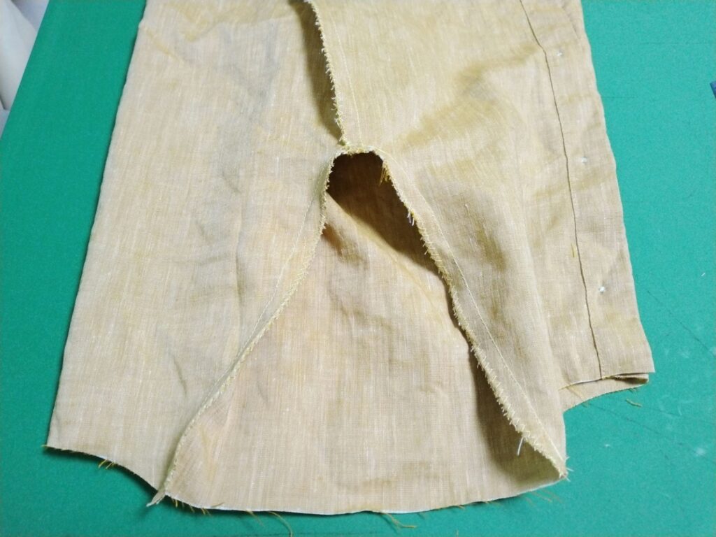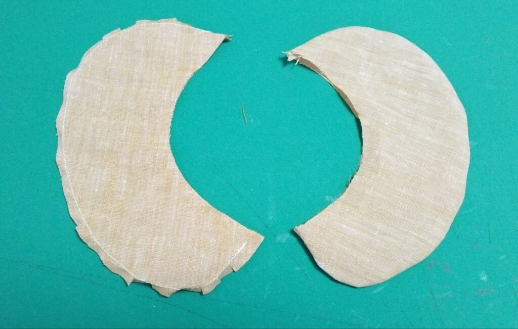 襟を中表で縫って表に返し、アイロンをかけておきます。表に返す前に曲線部の縫い代には細かく切り込みを入れておいてください。