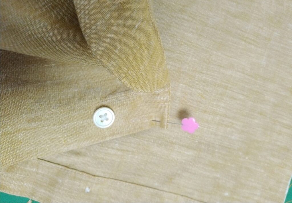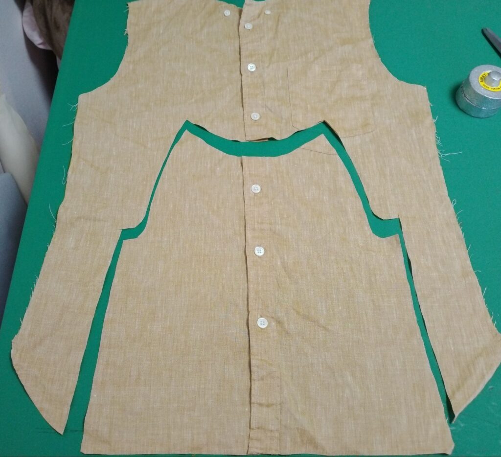 メンズシャツ前身頃の下部から前身頃。ボタンをそのまま使えるような位置で切ります。出来上がりからみたら、一番上のボタンをもう少しギリギリにしても良かったです。