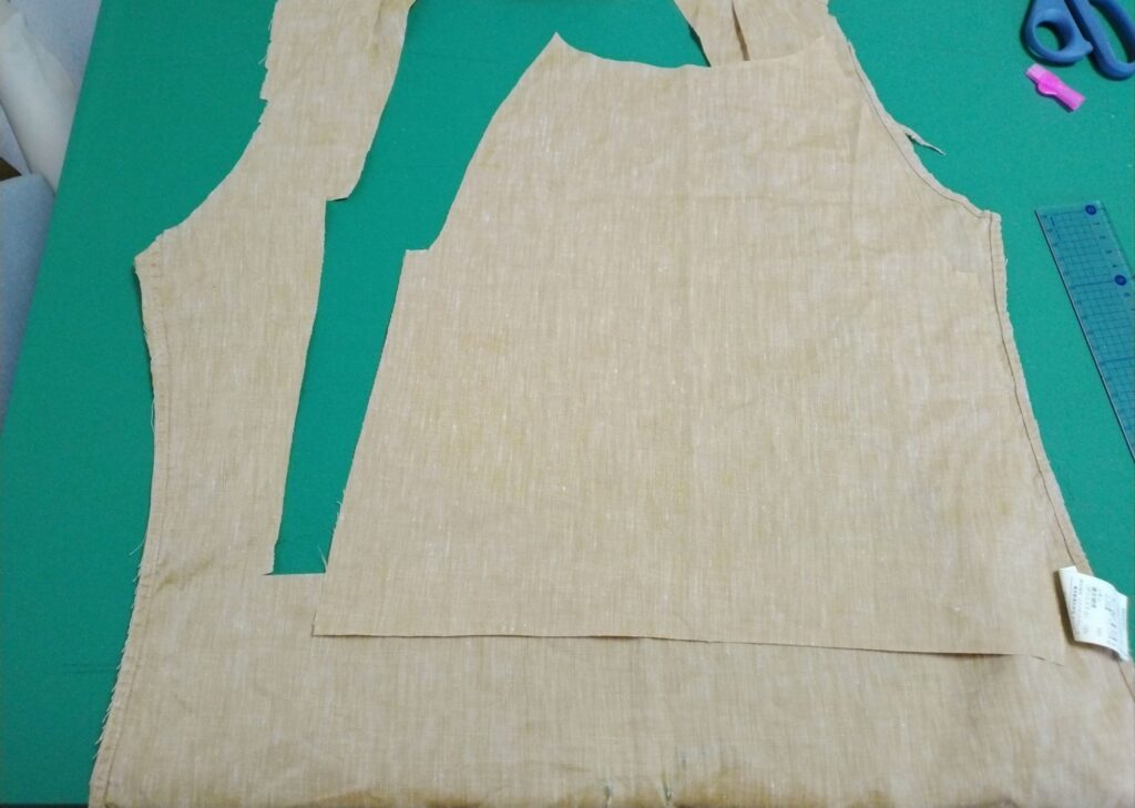 後ろ身頃から後ろ身頃。もともとのシャツのほつれが後ろ身頃の腰付近だったのでそこを避けて切りました。