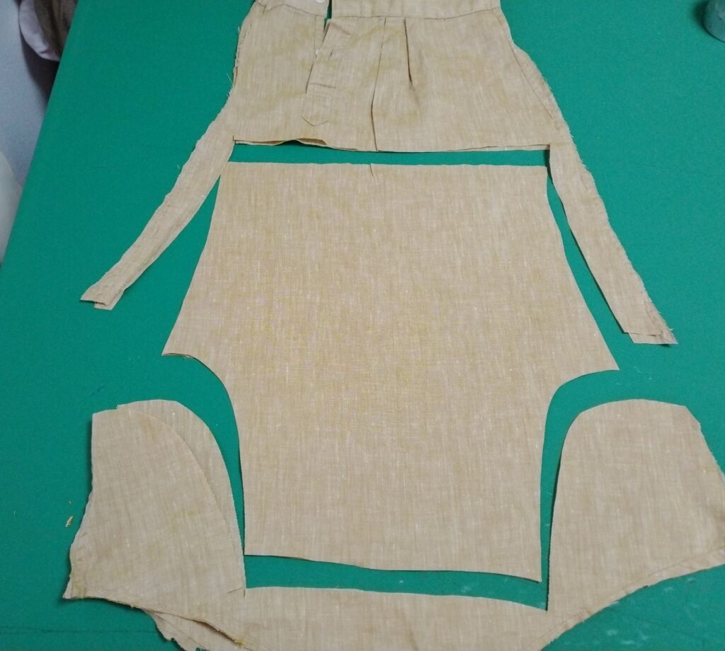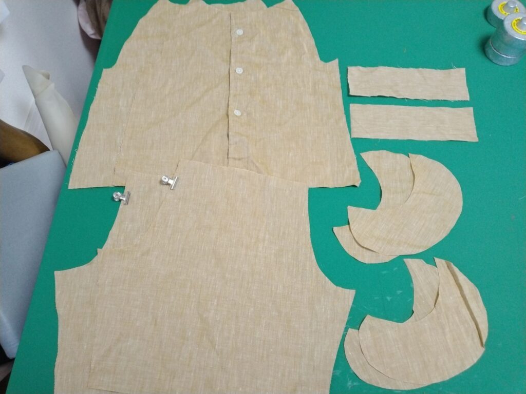 どこからどのパーツを切り出すかを大まかにイメージしてから切り始めないと、布が足りなくなるので注意してください。今回はシャツ→ブラウスなので、大体同じ部分に転用するのが繊維の方向的にも良いかと。