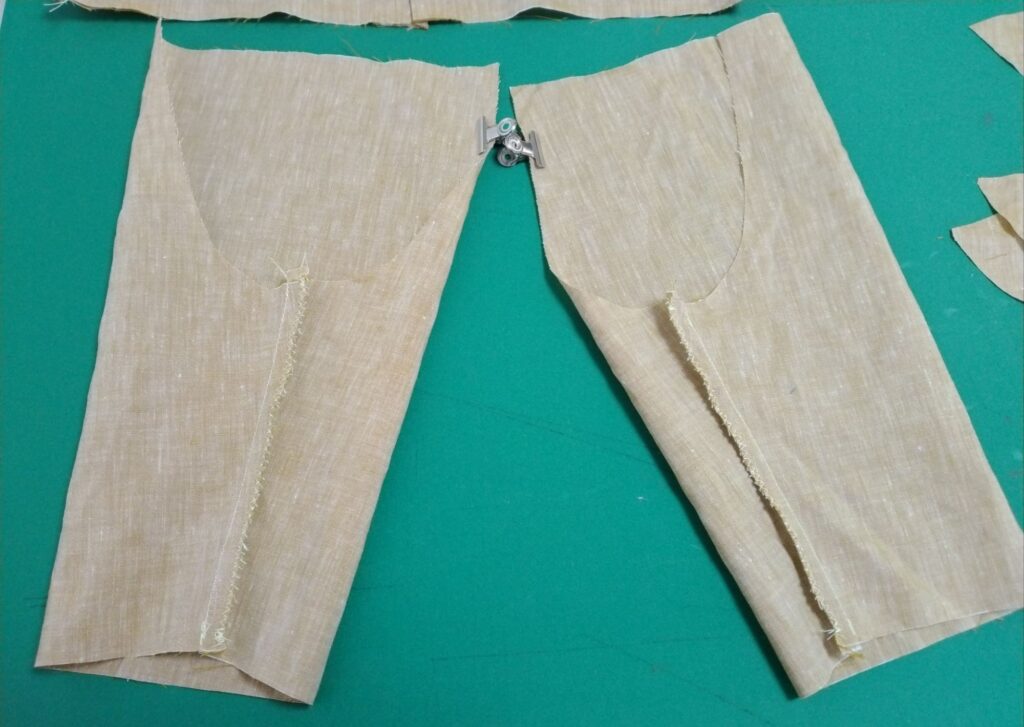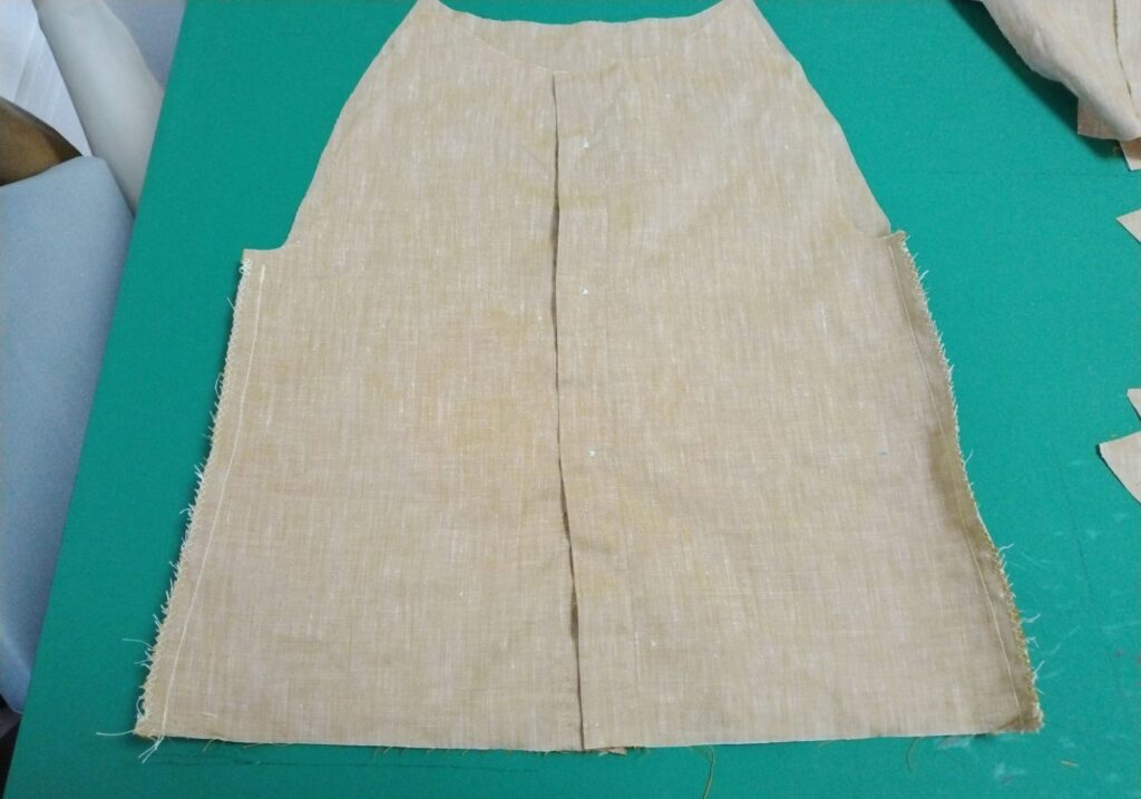 前身頃と後ろ身頃を中表で合わせて縫う。縫い代1cmで直線縫い、端にジグザグミシンをかけます。