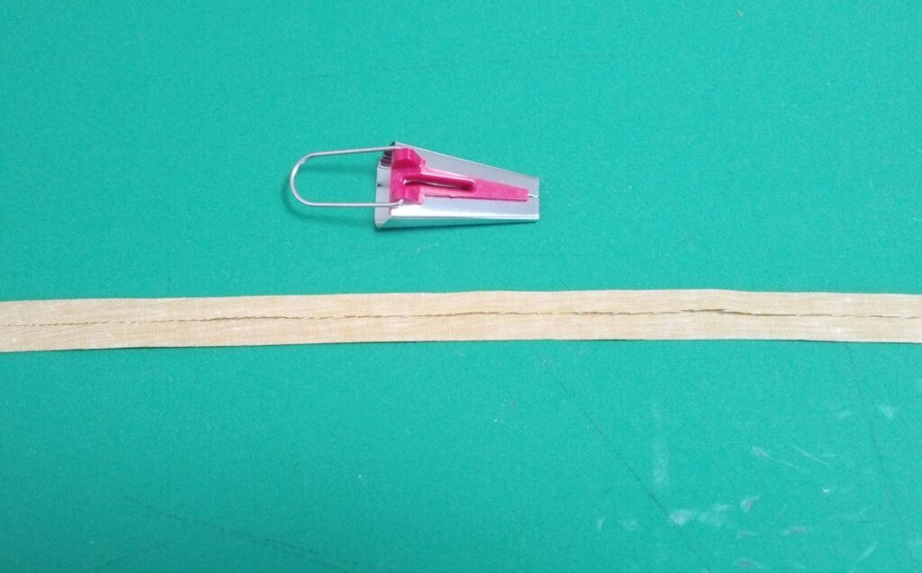 衿の端を処理するために、バイアステープを作ります。18mm用のテープメーカーを使いました。18mmのバイアステープを作る場合、布幅は35mm必要なので、今回は35mm×40cmを用意しました。