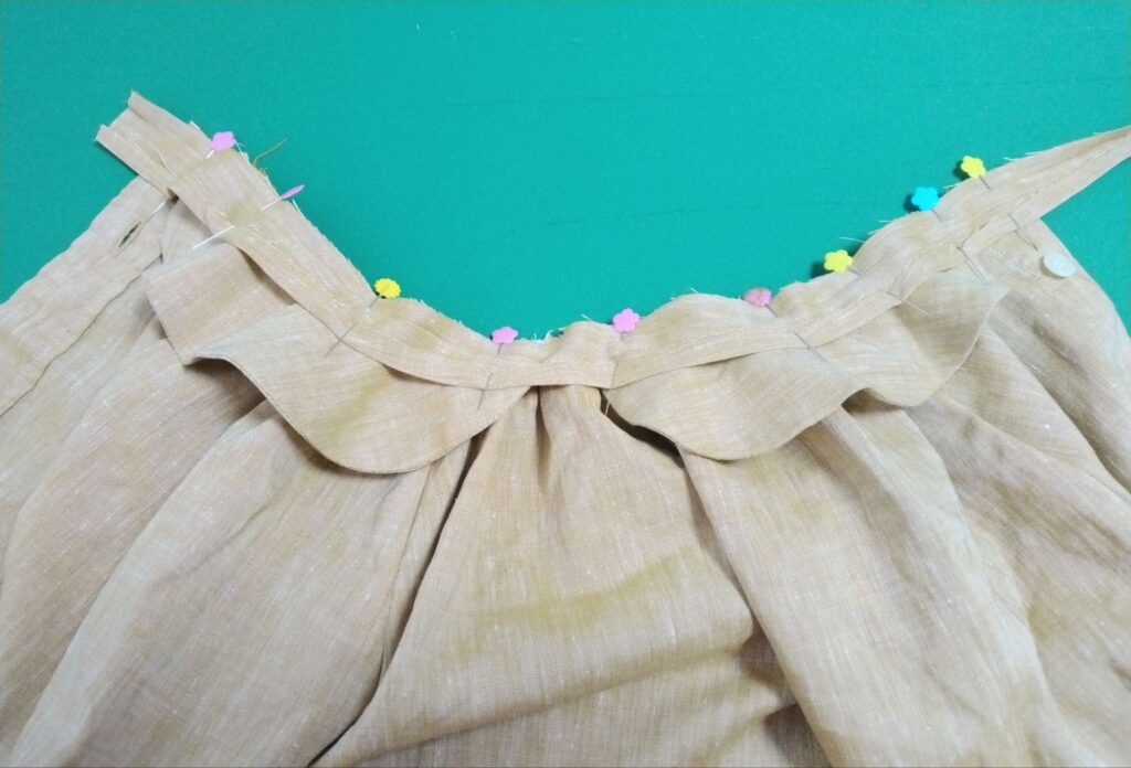 ギャザーのバランスを見ながら襟を合わせ、縫い代5mmで身頃と縫い合わせます。