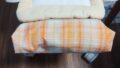 厚み4cmで裏に折り込まれる部分を5cmとすると三つ折り分2cmを合わせて、必要な布の大きさは202cm四方。今回使う布は110cmで両端が既にほつれ処理されている(下写真参照)物なので、2辺は三つ折りせずそのまま使うことにします。