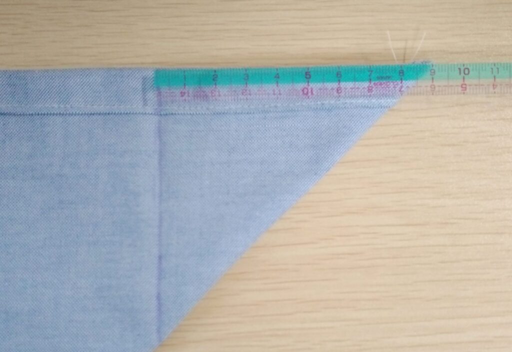 厚さ4cm、折り込み分5cmなので角を三角に折って先端から9cmのところを直線縫いします。