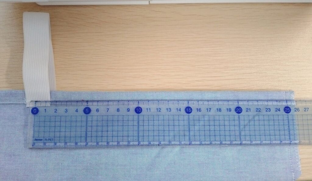 角の縫い線から25cmのところに20cmのゴムを縫い付けます。
