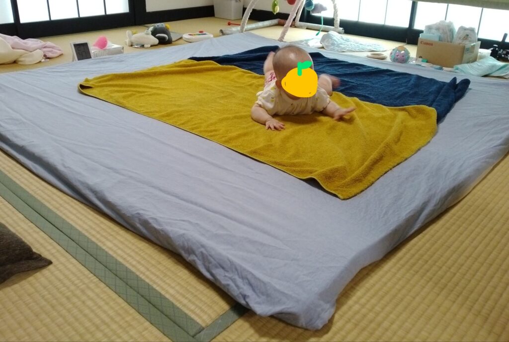 こんなかんじ。動こうとすると防水シーツもタオルもついてきてしまってなかなか動けなかったところ、自由にわさわさできるので娘も喜んでいます。