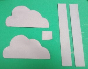 材料:ウォッシャブルフェルト3色、アクリル紐、吊り下げ用紐