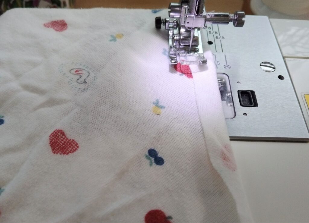 肌着なので縫製部分が肌に触れないよう内側ではなく、1cm程度外側に折り、ジグザグミシンをだーっとかけます。
